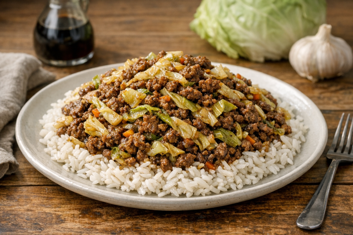 A quick and easy stir-fry with ground beef and cabbage served over cooked rice. It's savory, comforting and absolutely delicious. This recipe is prepared with readily available ingredients and can be made even by a beginner.