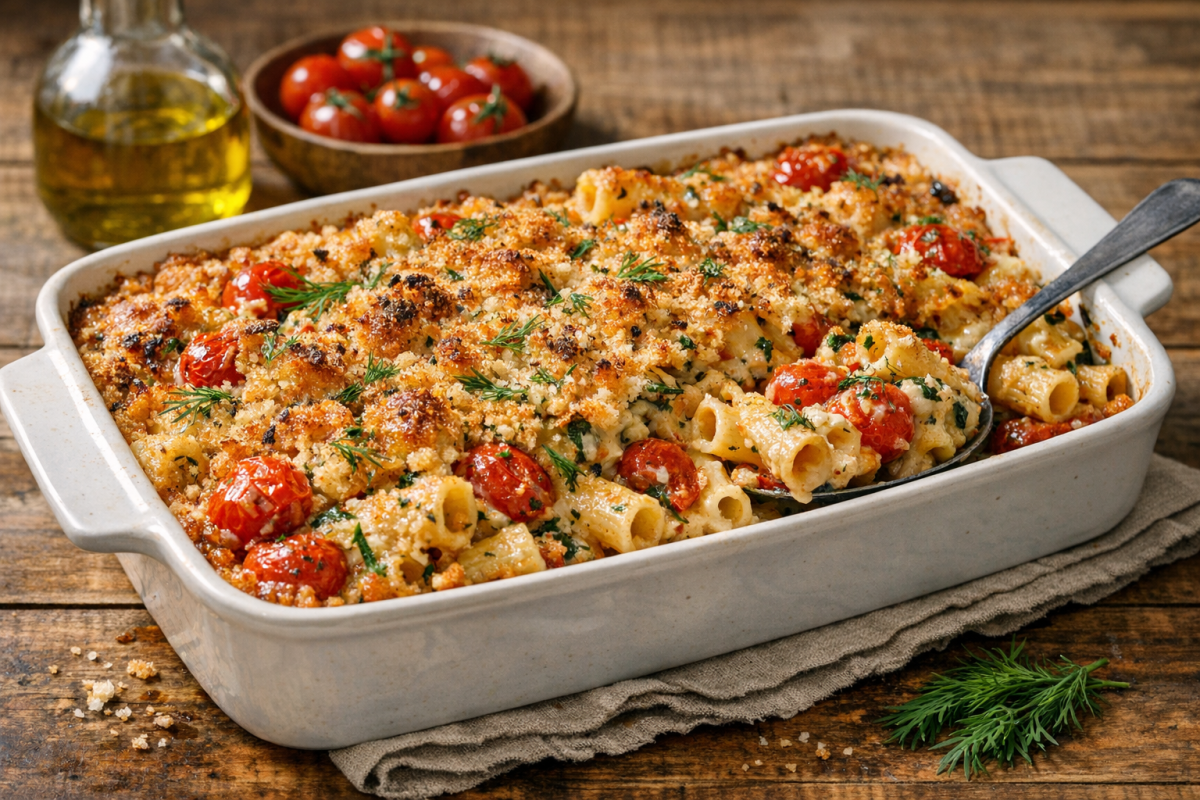 This baked pasta dish showcases cherry tomatoes slow-roasted for maximum sweetness, then tossed through tender pasta with fresh dill and a hint of Dijon mustard. The creamy glaze settles into the nooks of the pasta, offering a subtle tang complemented by the buttery crisp topping. This comforting yet elevated bake has a golden finish and an aromatic, savory flavor, making it satisfying for gatherings and family suppers alike.