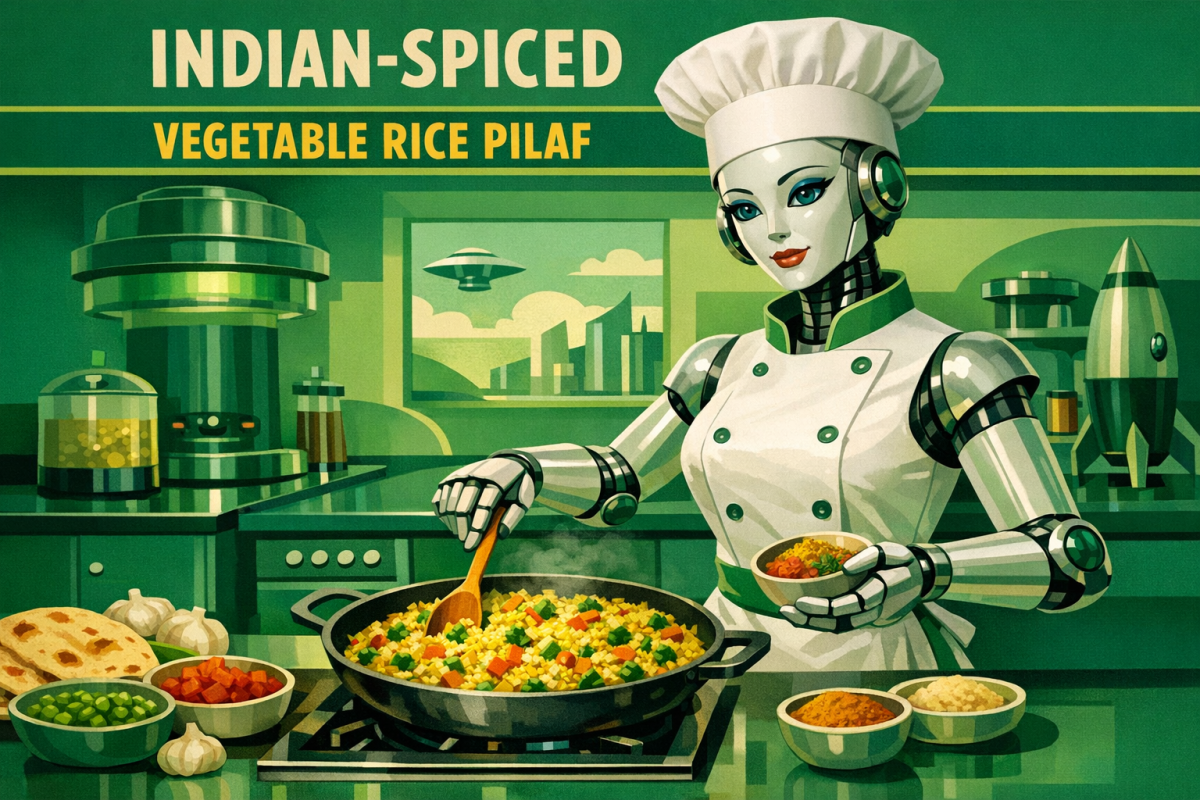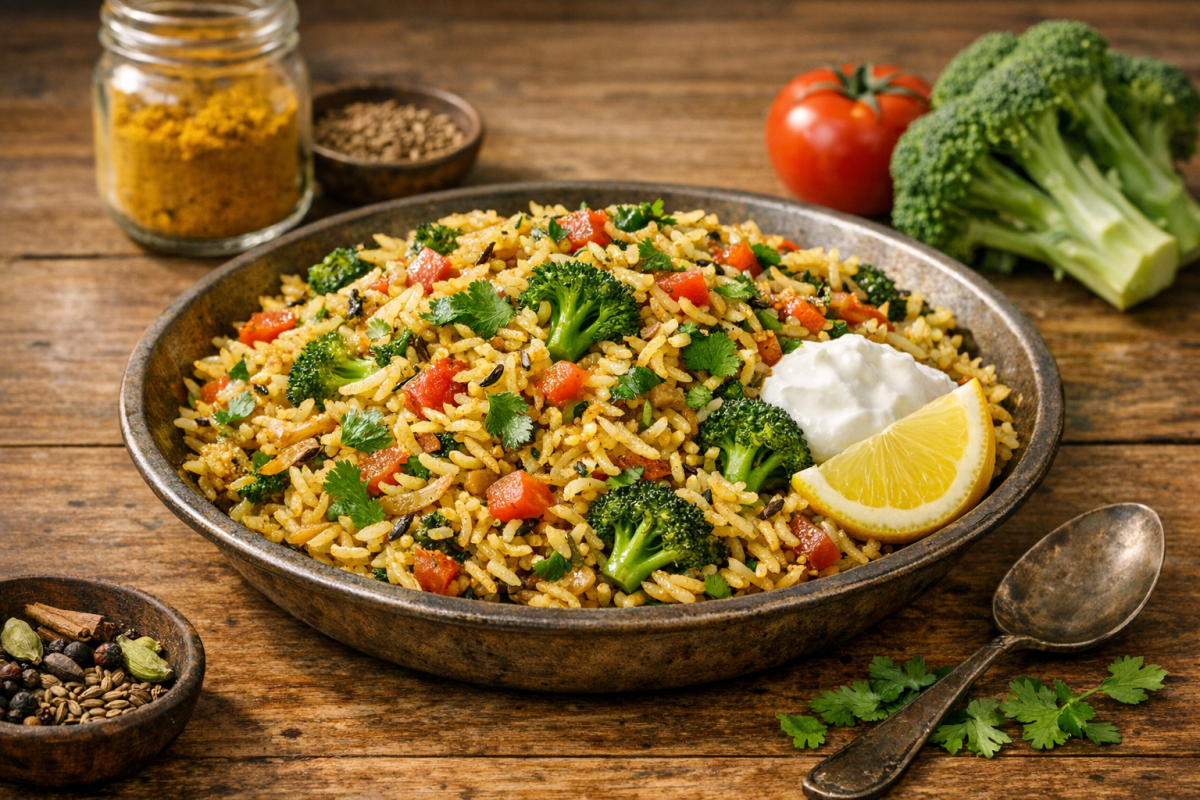 This Indian-style rice pilaf blends aromatic whole spices and sautéed vegetables for a colorful, nourishing supper. The warming spices infuse each grain of rice, while broccoli, onions, and tomatoes add layers of flavor and texture. Light and fluffy, yet deeply flavorful, this dish pairs beautifully with a dollop of yogurt or a wedge of lemon if desired.