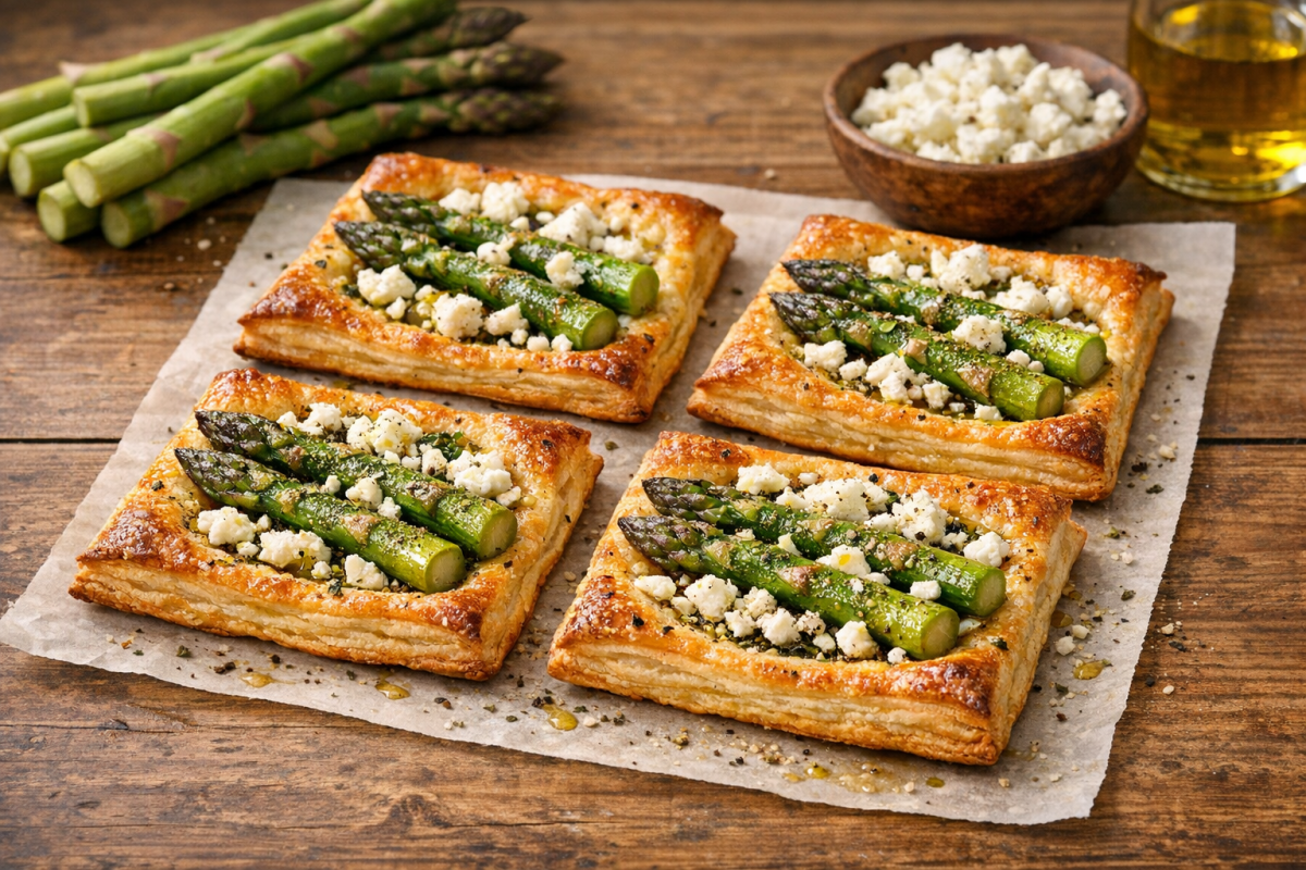 Scatter crumbled feta over the asparagus, then drizzle each tart with olive oil.